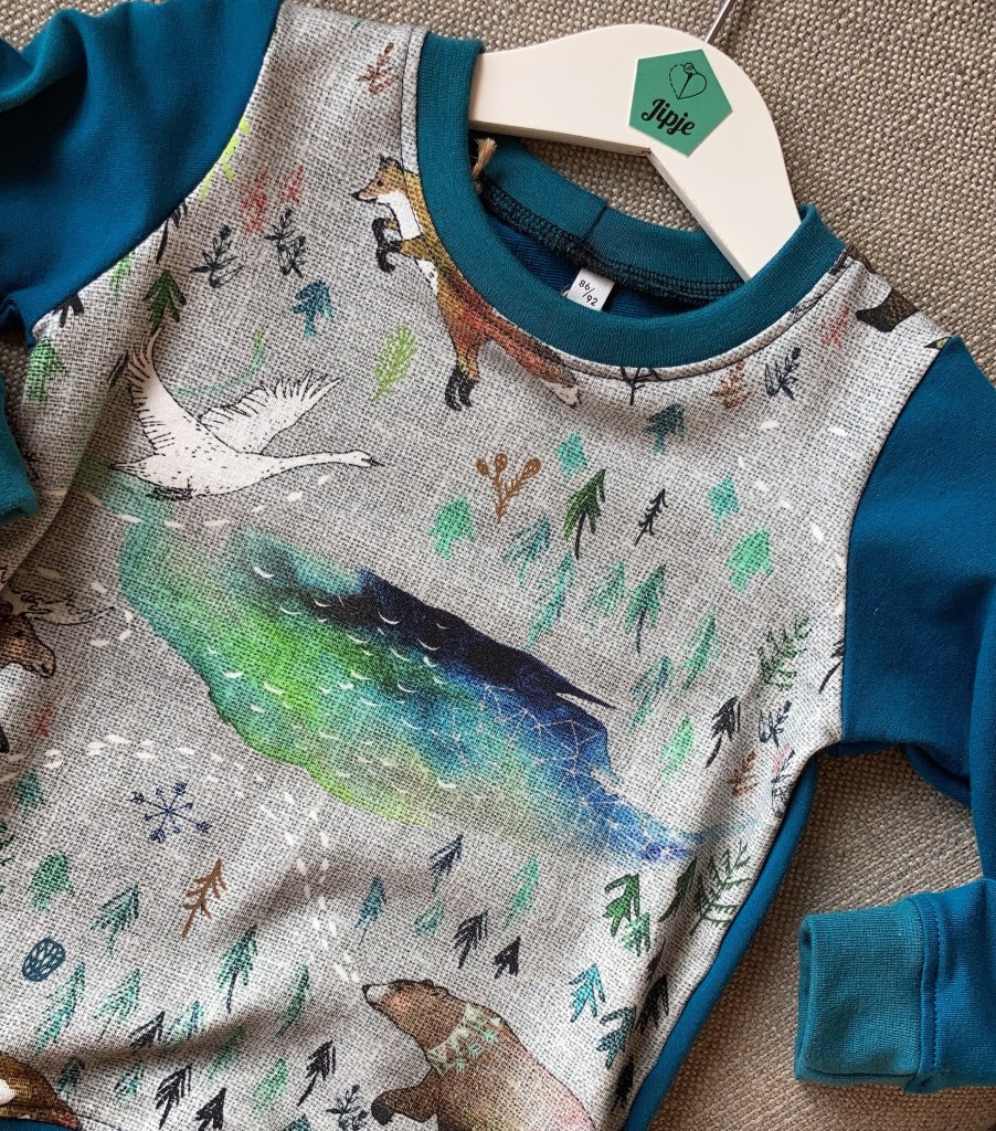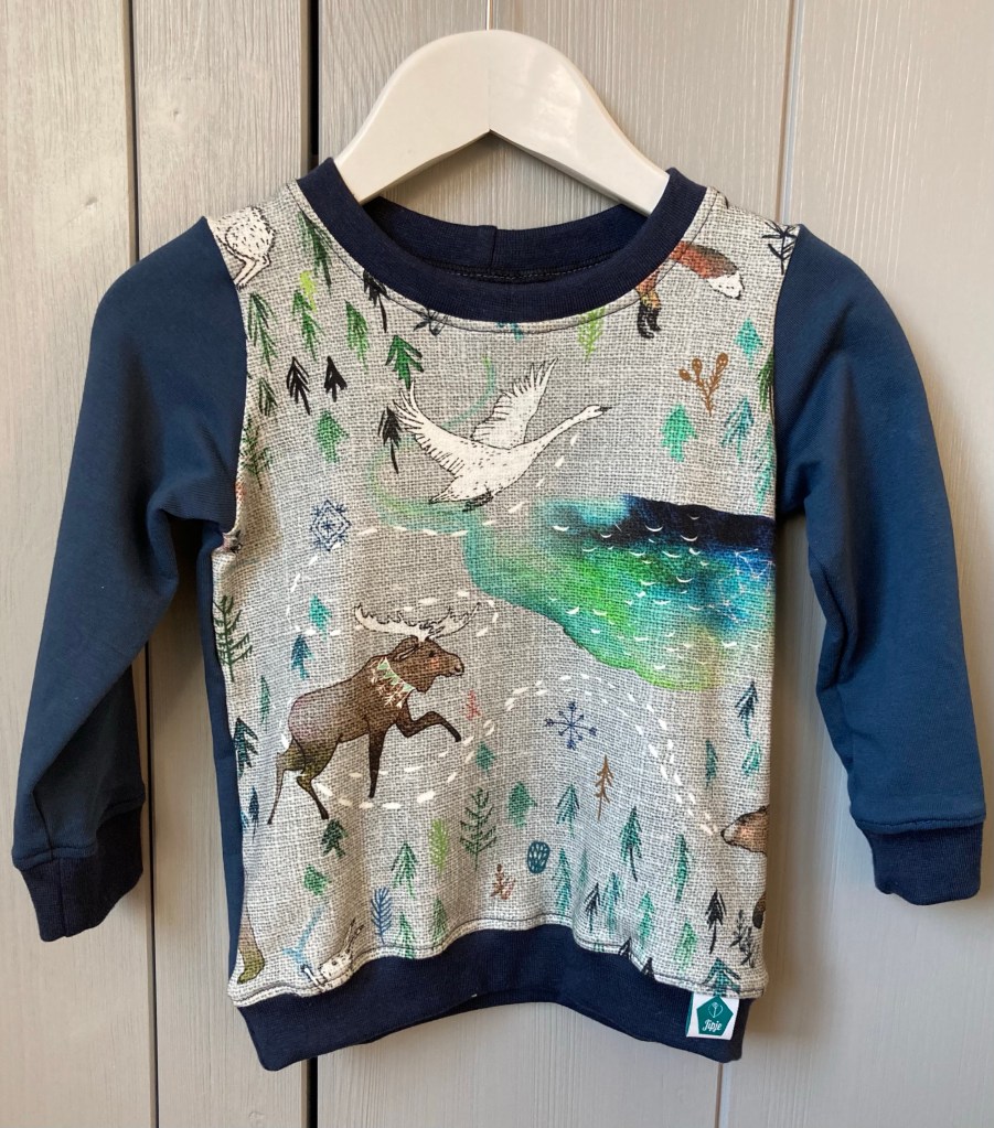 De Yukon-sweater is nog beschikbaar in blauw in maat 74/80 en 98/104 (of mail me voor andere maten met een langere levertijd). Deze trui is gemaakt van biologische katoen (French Terry) en daarmee een lekker warme trui voor de winter.